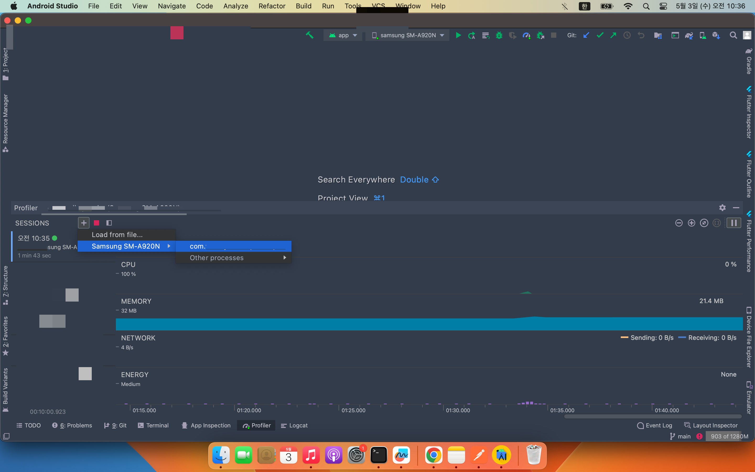 (2) Profiler > + 버튼 > 디바이스 선택 > 어플리케이션 선택