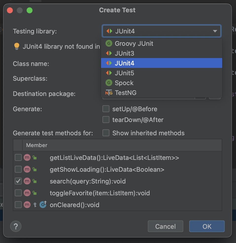 해당 클래스에서 테스트할 함수를 클릭하면 됩니다.(그냥 빈함수만 만들어줍니다.)